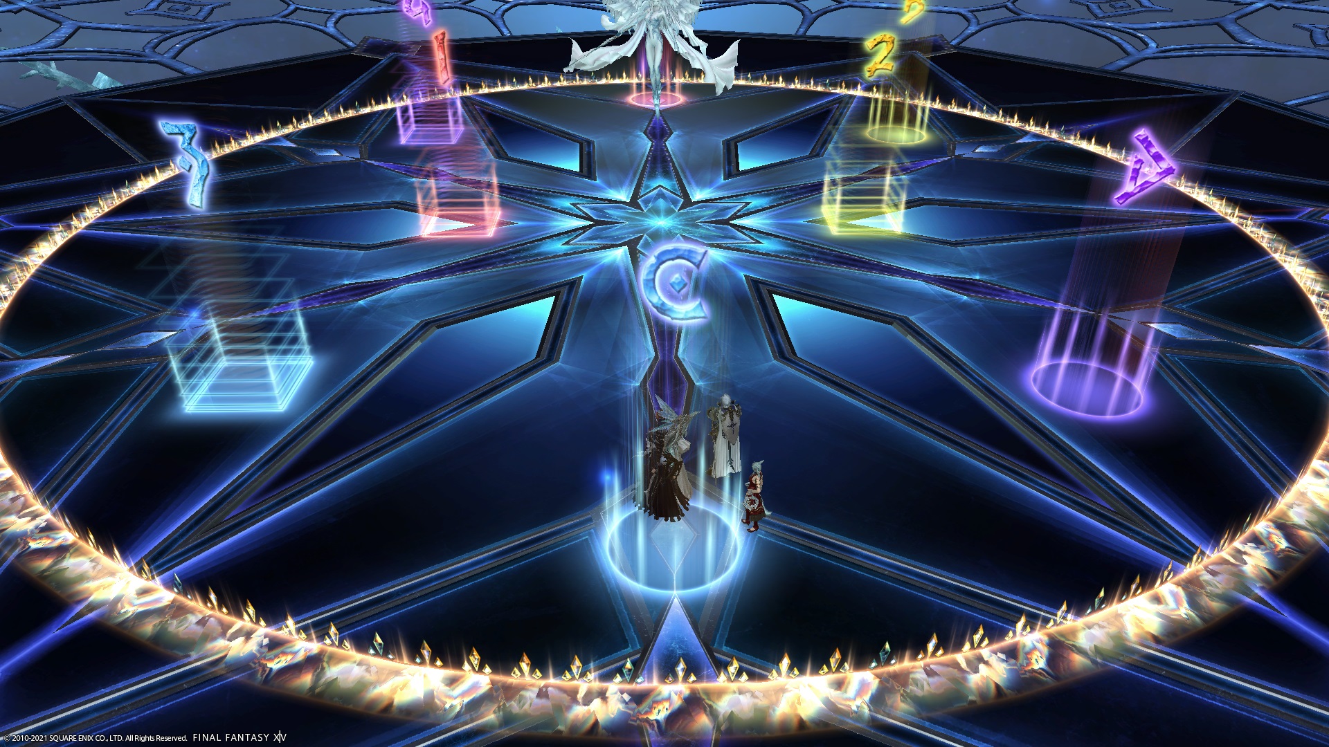 ACare for orientation.Ais important because the boss will teleport a little north of the center during the fight.12are for water stacks - have the MT bring the boss center and faceAright after the final Lightwaves to avoid confusion during the party stack→light party stack sequence.