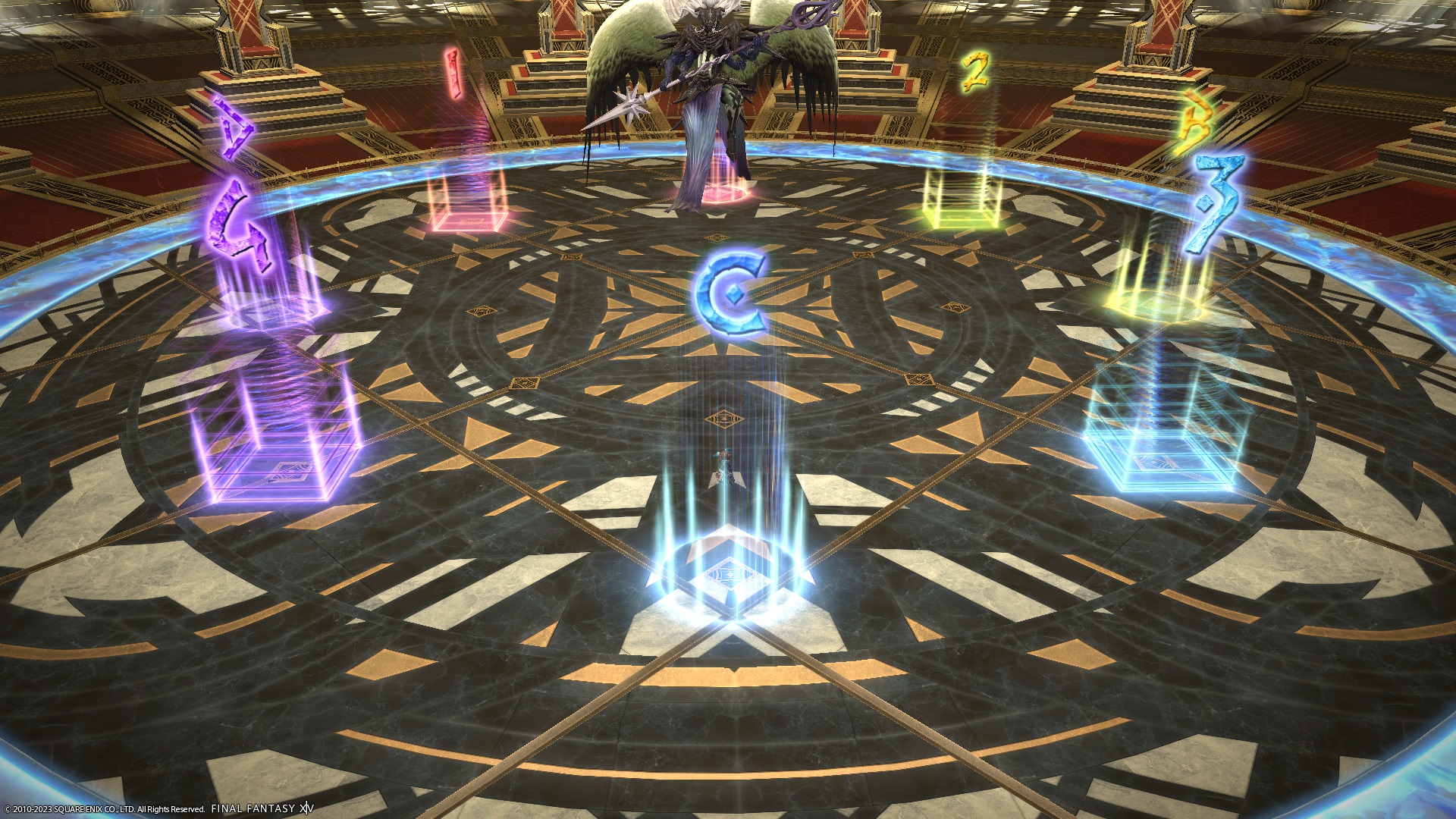 4. Orbs will appear at the cardinal locations. Rotate clockwise if needed so that you are standing at the opposite coloured orb to whatever the boss glowed in the previous step. | ![]() |