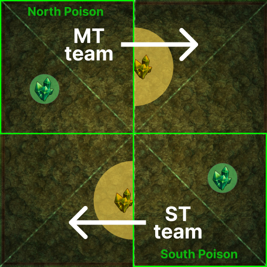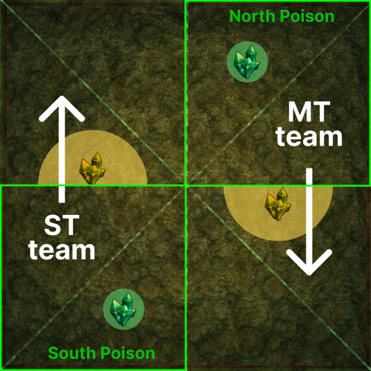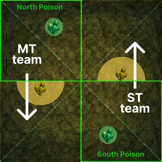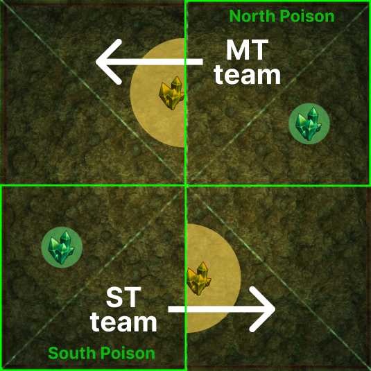 The way Game 8 chose to resolve Ruby Glow 5 is to assign the MT group to the north-side poison quadrant, and the ST group to the south side poison quadrant.