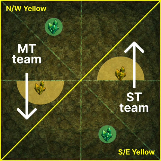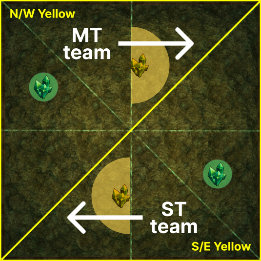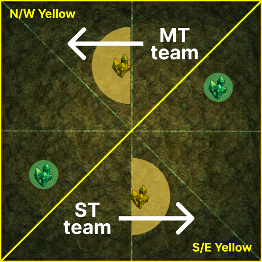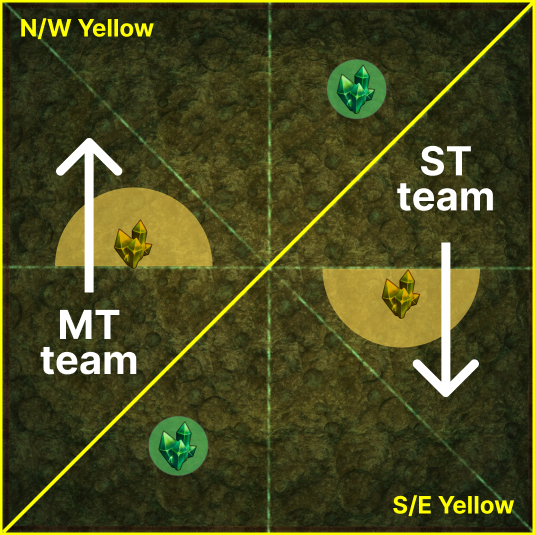 | This refers to a different method of assigning quadrants that some EN groups do. The main difference is what the party pays attention to. Game8 unfortunately chose the strat that focuses on the poison crystals, which leads to a somewhat counterintuitive case 1/4 of the time. This strat assigns the light parties based on the yellow crystals instead, which keeps to the "MT group N/W", "ST group S/E" convention. The problem, of course, is that both methods work out to the same outcome in 3/4 of the cases, but not the last 1/4. | |