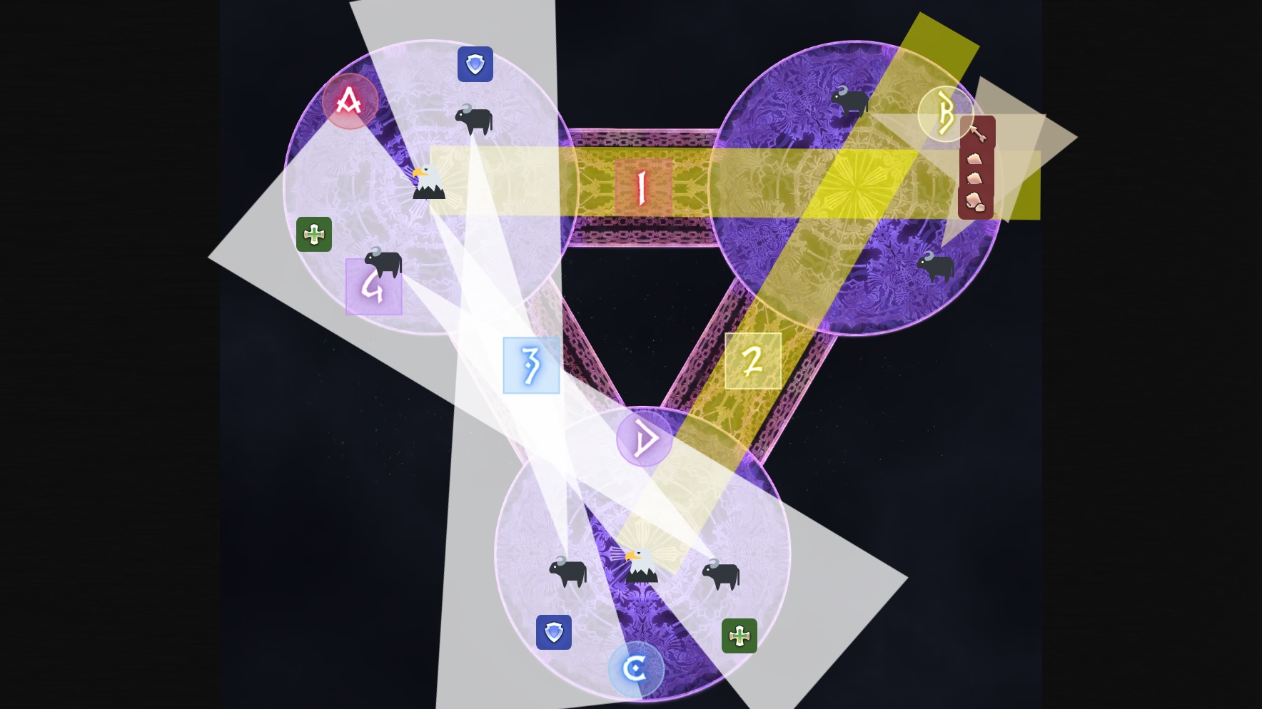 All markers are used for Sleepo’s Purgation. Of note, the spread position for the outer-left positions (B and 2) are directly west/east of the markers.