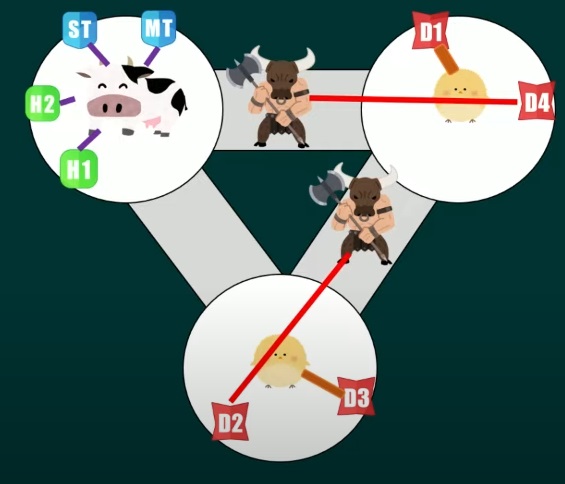 The group tethered to minotaurs need to cross tethers to avoid hitting one another.