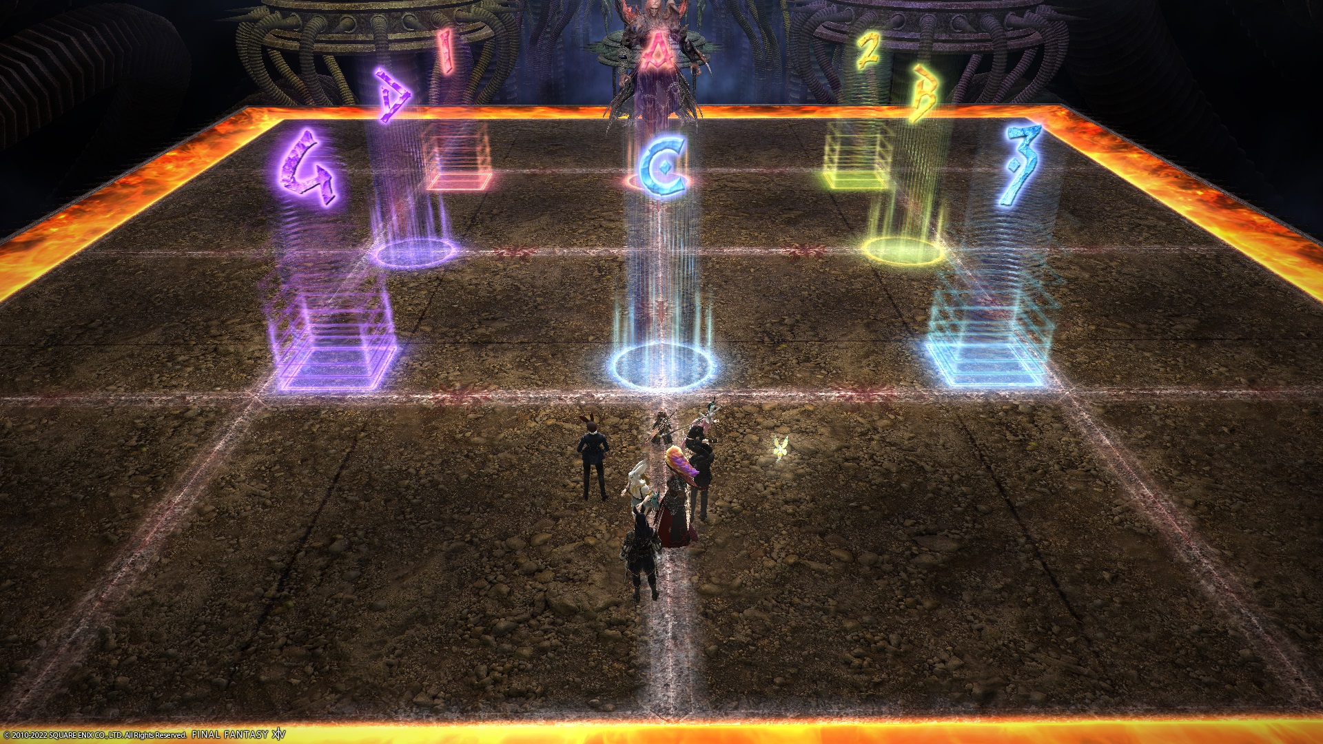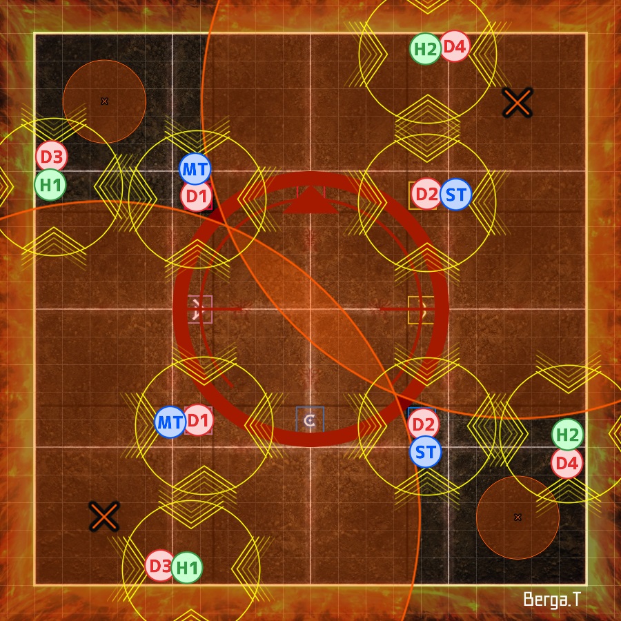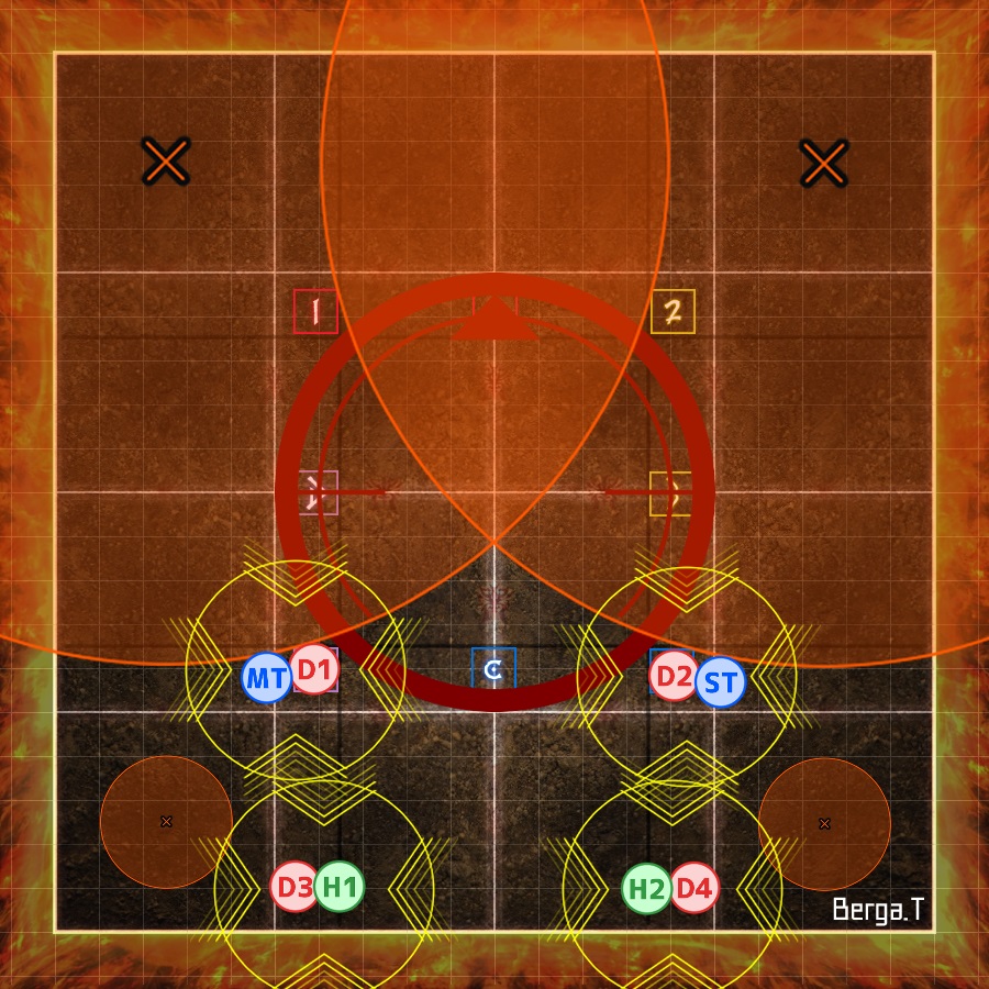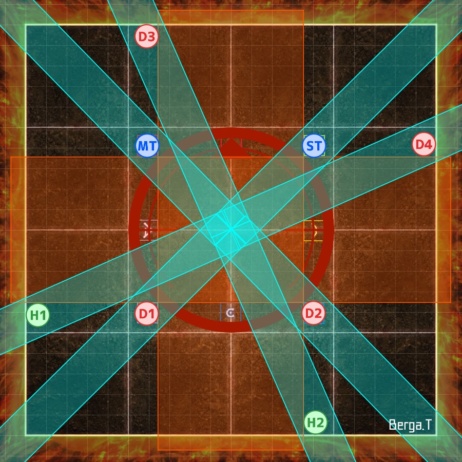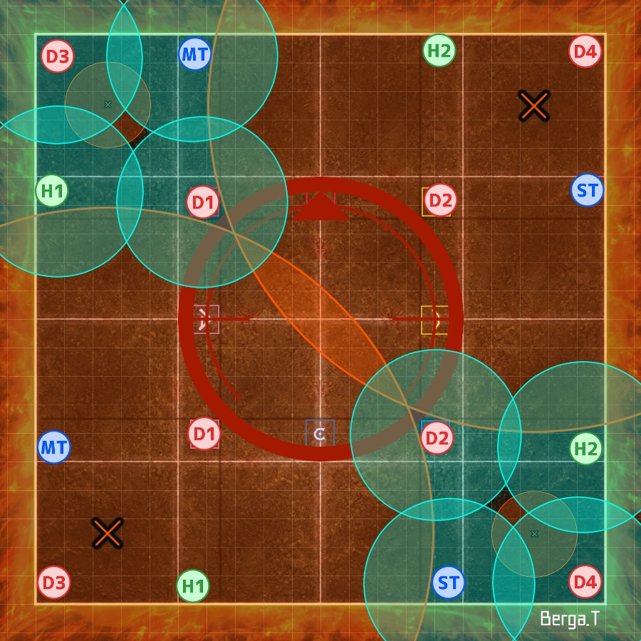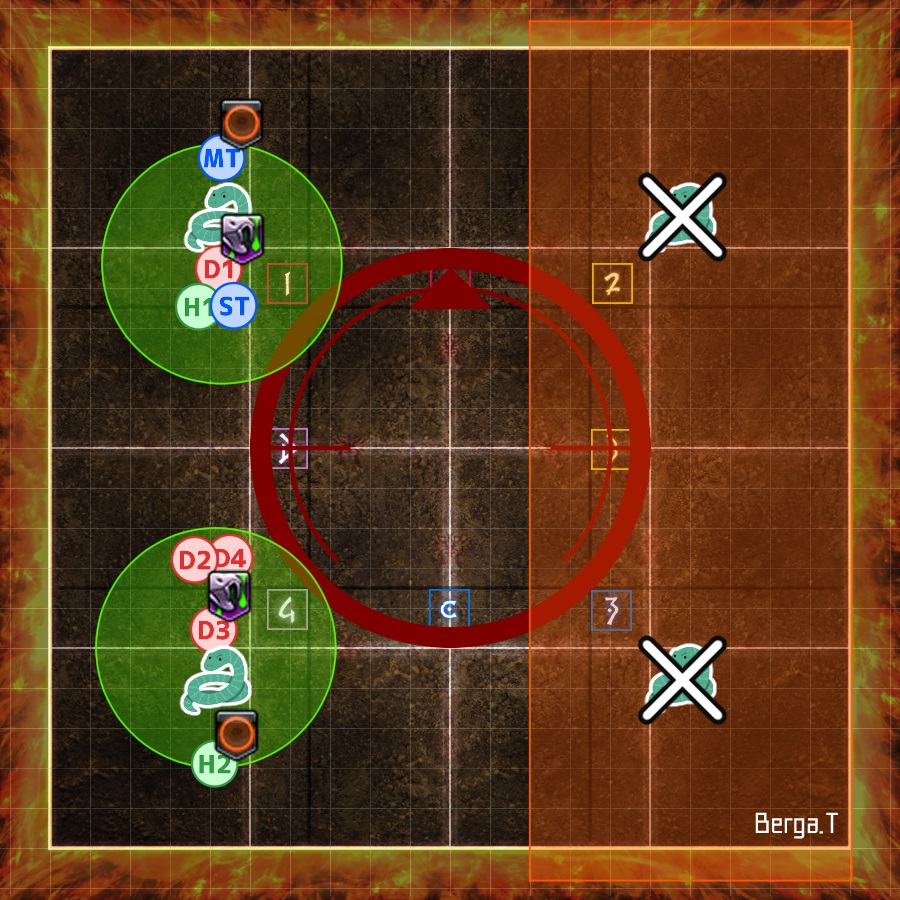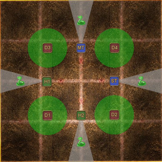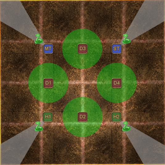 | Each T/H + DPS pair takes turns petrifying the Gorgon in their quadrant (demarcated by the coloured markers). The player that is not petrifying the Gorgon places their poison puddle out of the way. | | |