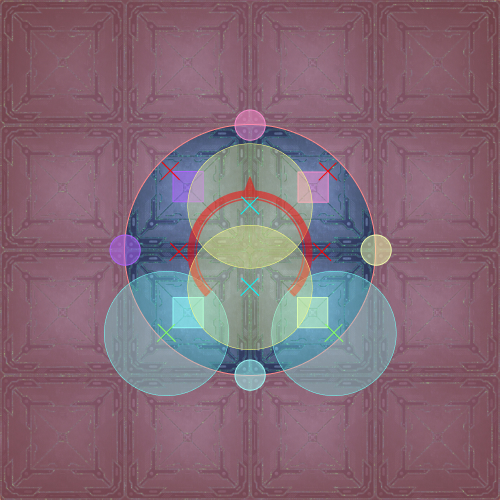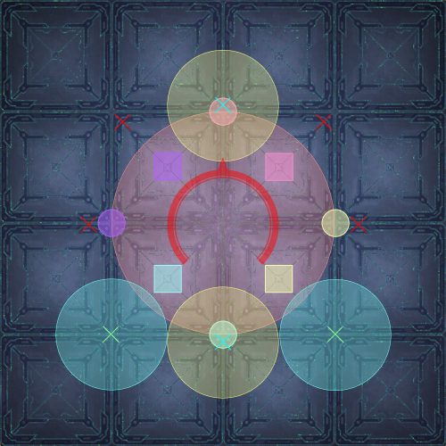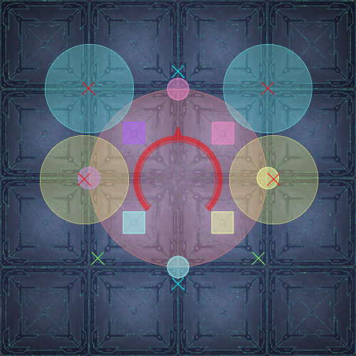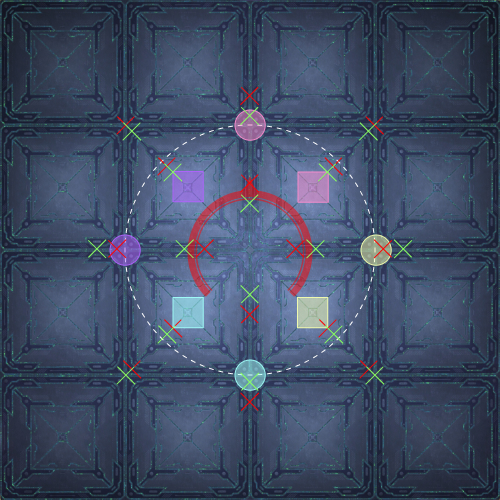 | Each role has two reference points that dodge the boss's Narrowing Witch Hunt or Widening Witch Hunt. Then, each reference point has two positions- one "inner" and one "outer" position. Using the diagram to the right, all players will dodge to the green → green → red → red marks, based on their clock positions. | |