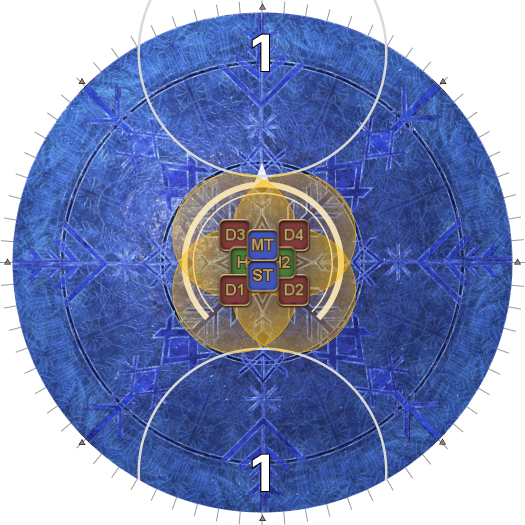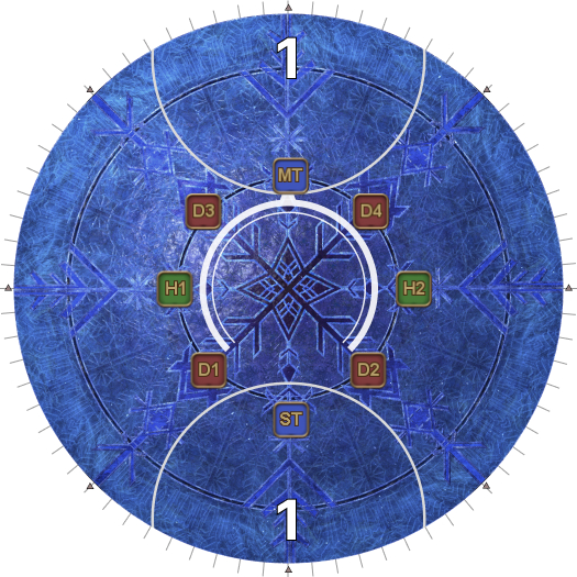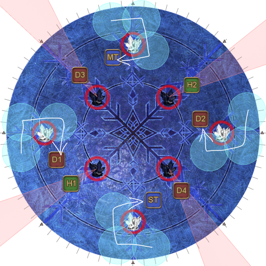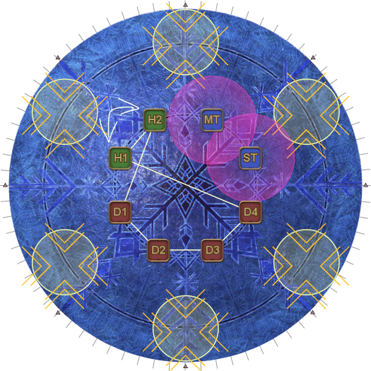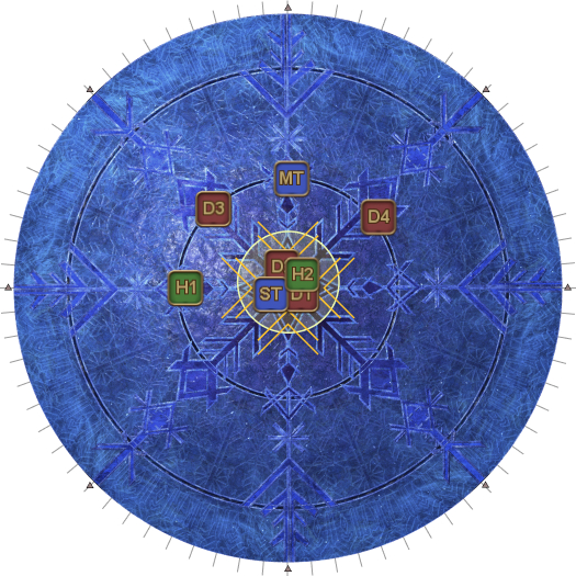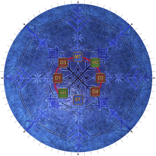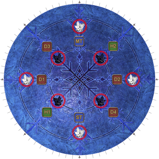 | 30. Four Crystals of Light and four Crystals of Darkness appear as shown in the diagram. The objective is to destroy the Ice Veil in the middle that's casting Endless Ice Age without destroying the four Crystals of Darkness. However, while the Ice Veil is targetable, it is immune to damage while there is a Crystal of Light on the arena. The healers/ranged DPS should help their tank/melee partner destroy the Crystal of Light in their sector first. | |