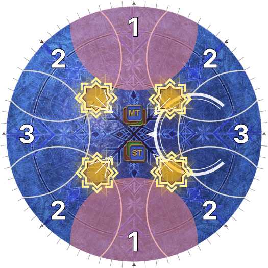 | 7. Knockback from the center into where the first circles were. The second circles will also resolve. Wait here for the star AoEs to resolve. | |