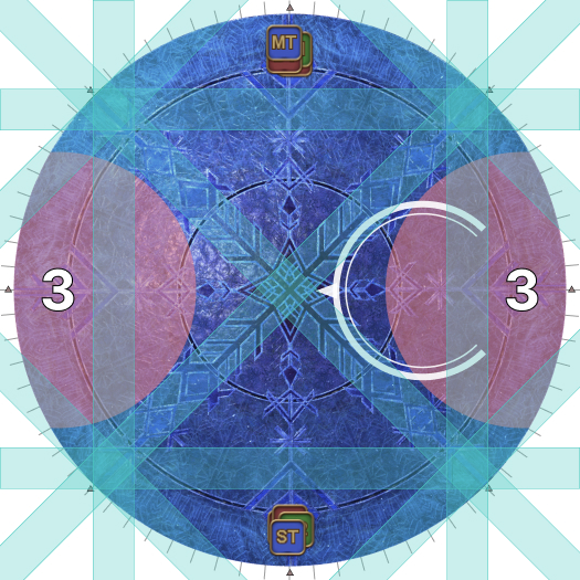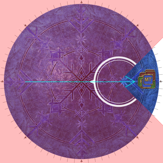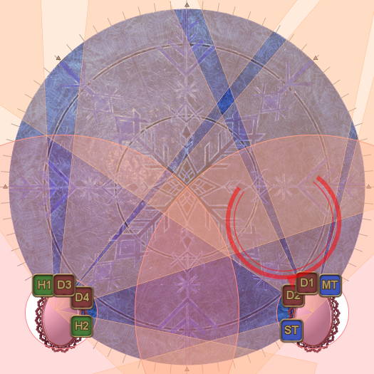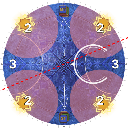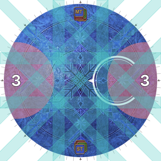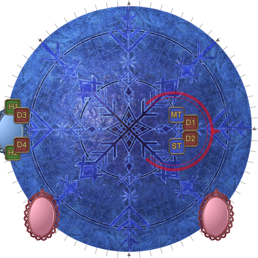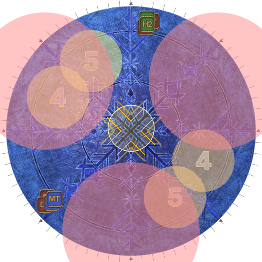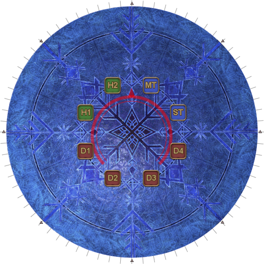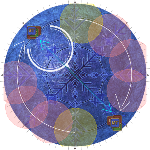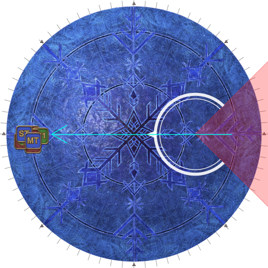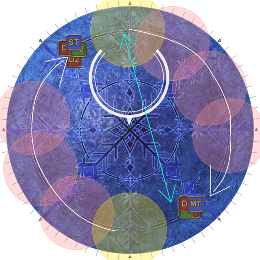 | Case 4: The Usurper of Frost is 45 degrees clockwise from a party. The party closest to the Oracle of Frost cannot drop their puddles directly behind the Oracle of Frost, so they will slowly go anti-clockwise. The party further from the Oracle of Frost will go slowly clockwise. Both parties will meet 135 degrees away from the boss, and the next movement will be slanted. | |