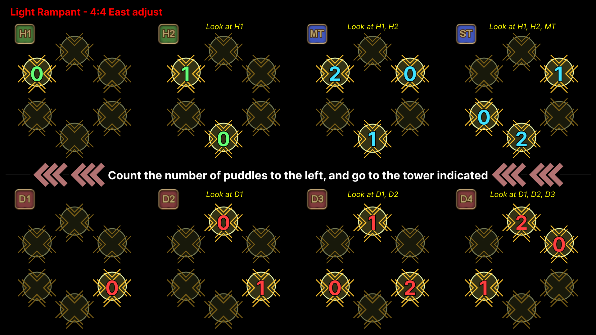 | 21. The two puddle players drop one puddle towards the outside, before rotating clockwise, dropping five puddles in total before joining their group NNE and SSW. The tether players wait for their towers to resolve (Bright Hunger) before collapsing with their group. | |
