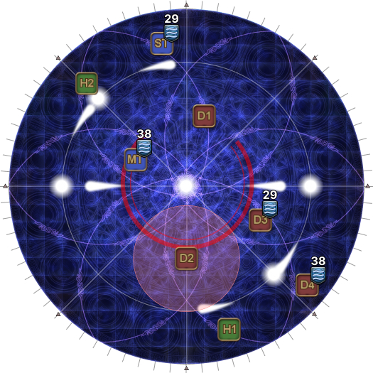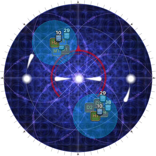| 22. The second set of Dark Water III stacks resolve together with the fifth set of AoEs. The ST moves out 90 degrees from where the first set of lights pulsed. | |