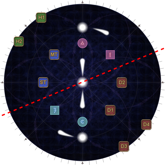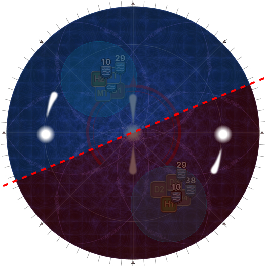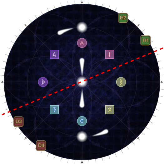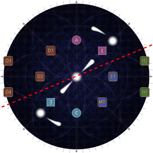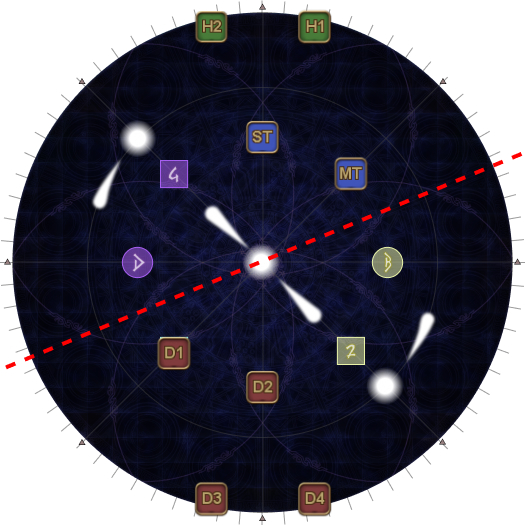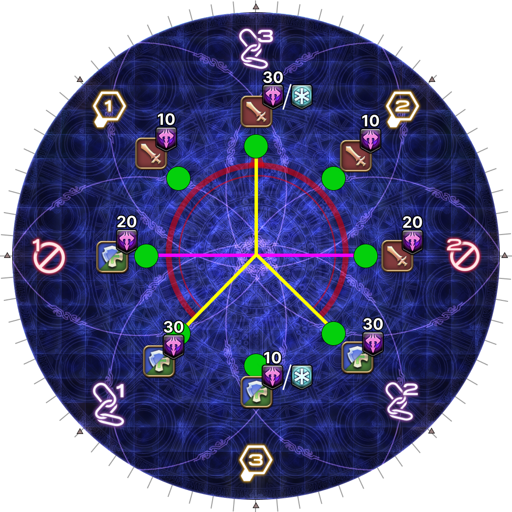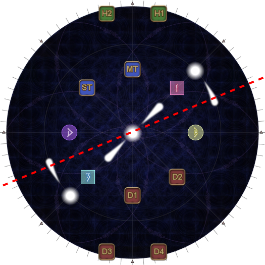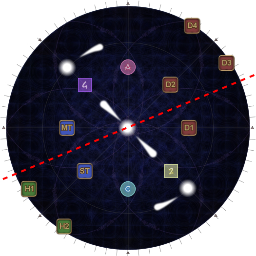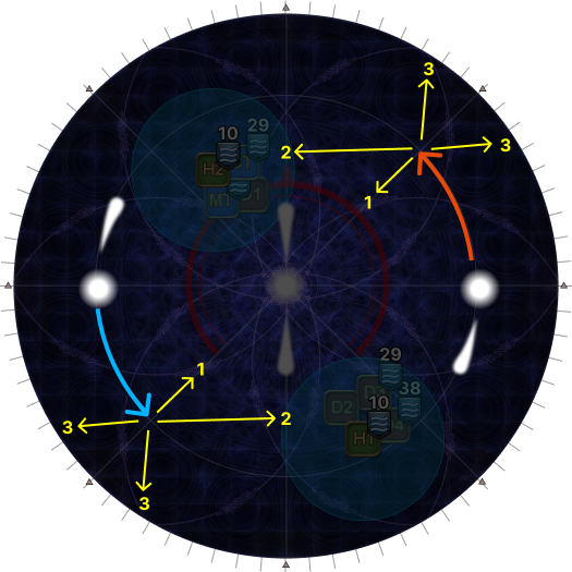 | The tethers make a shape like the kanji character 大, with a single yellow tether pointing upwards. Find the 大 and orient to it with the single yellow tether as North. Take up assigned clock positions based on your Fire group. |