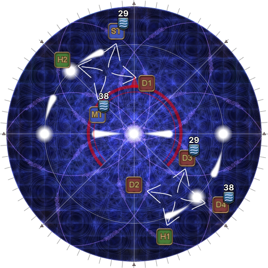 | 24. The tank that baited Darkest Dance rejoins their group. Everyone moves towards the boss, and positions to prepare from a knockback from the boss in their groups.