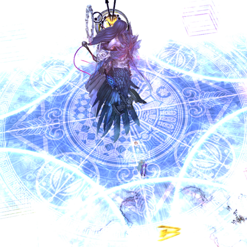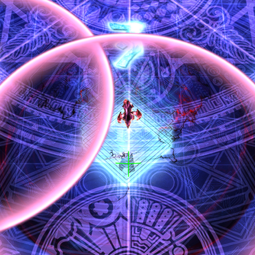 | 17. The boss will return to the center. The trails will continue for a total of six pulses (indicating six upcoming sets of AoEs) and end up in this formation relative to the first set of pulses. All party members will get a spread marker. Just like before, spread out in your previous box formation in the positions at Step 14. There will be a large white circle on the floor- the front positions should stand on the edge of this circle to avoid the center Apocalypse. | |