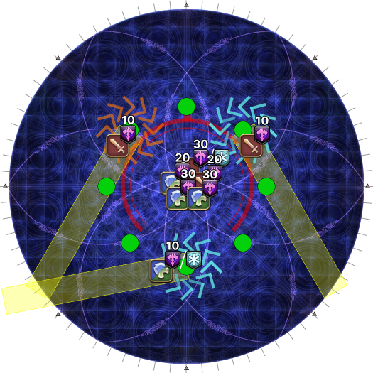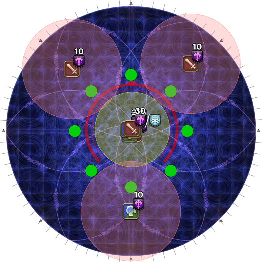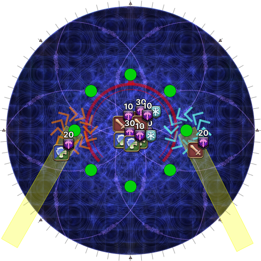 | 19. The second set of AoEs resolve together with the party's spread markers. Move as soon as the spread AoEs resolve. | |