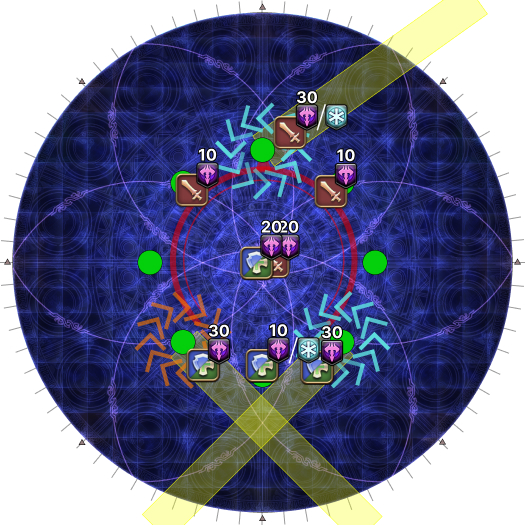 | 10. Group up with tanks/healers NNW, and DPS SSE, and form a box. When Water III debuffs come out, look within your group for duplicates (nothing, 10s, 29s, 38s).